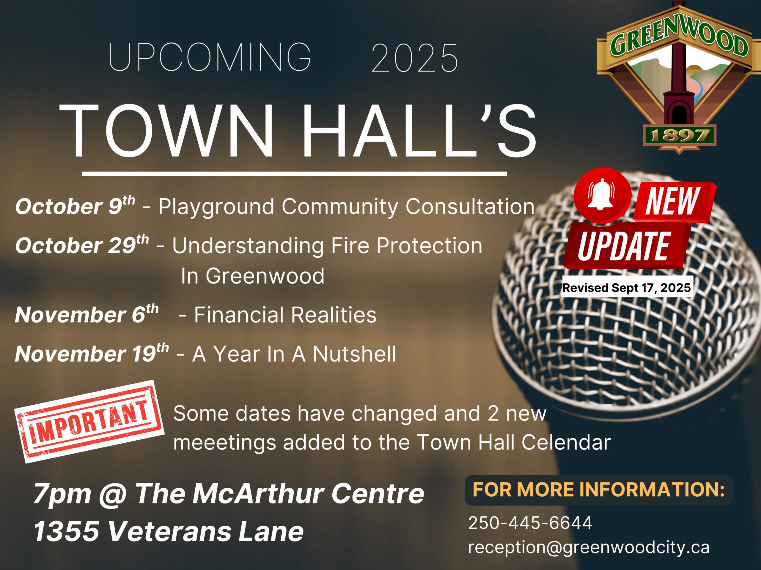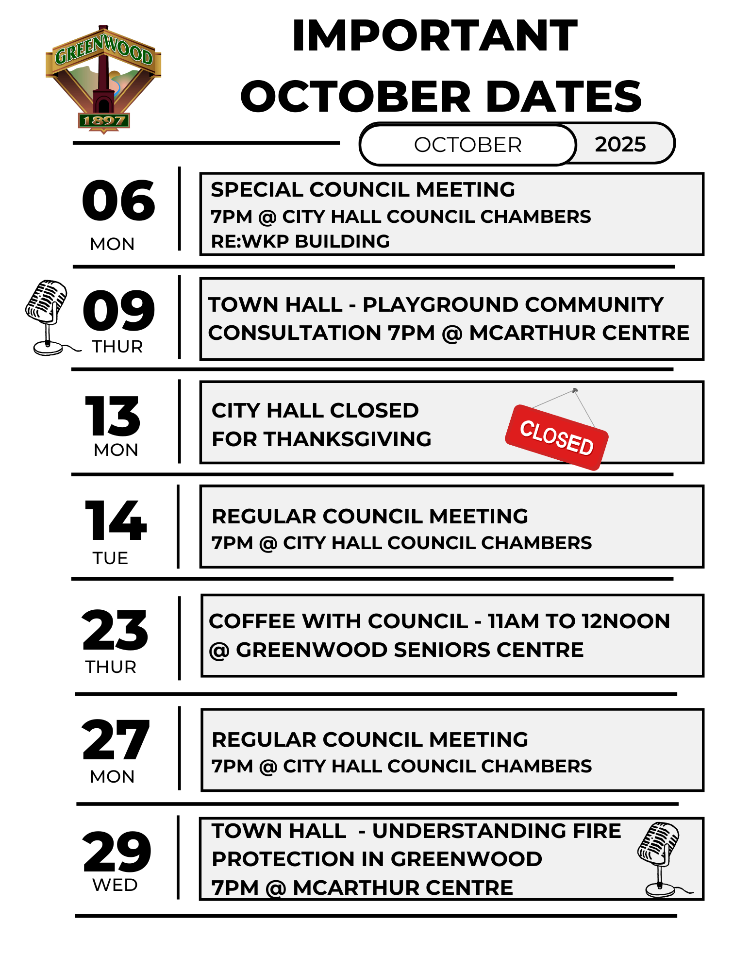 Quarterly utility payments are due on March 31st, June 30th, September 30th, and December 31st. If paying in person, please come to Greenwood City Hall located at 202 South Government Avenue. A drop box is located outside the front door if the office is not open. If paying online, please make your payment 5 days in advance of the due dates listed to avoid late payment penalties. E-transfers are accepted, please email: [email protected]. Credit card payments are accepted for property tax and utility payments only. A 2.00% service charge applies to all credit card payments. If you have any questions regarding your property tax or utility accounts, please contact City Hall at 250-445-6644 or email: [email protected]. Thank you.